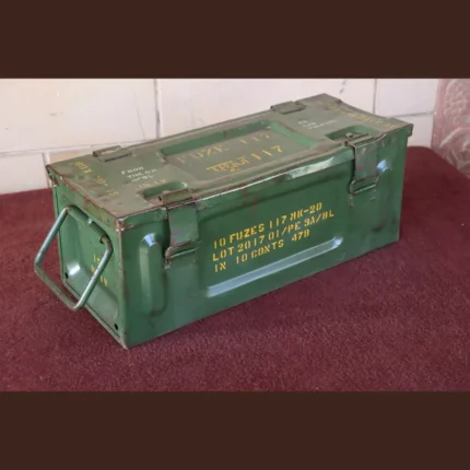 Authentic Ex-Army ammunition tool box made of heavy iron, size 12×6×7 inches, finished in classic brown. Rugged and durable, perfect for storing tools, valuables, or collectibles. Ideal for jeeps, tractors, workshops, or vintage décor. Each piece carries unique military character.