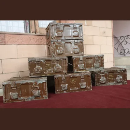 Vintage ex-army iron ammunition box (approx. 5 kg) in brown finish. Built tough for military use — excellent as a tool box for Jeeps, Thar, gypsies, or tractors. Repaintable and durable; store heavy or valuable tools safely. Perfect for collectors, farmers, mechanics, or as rustic home decor.