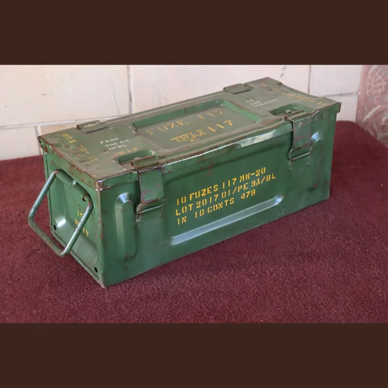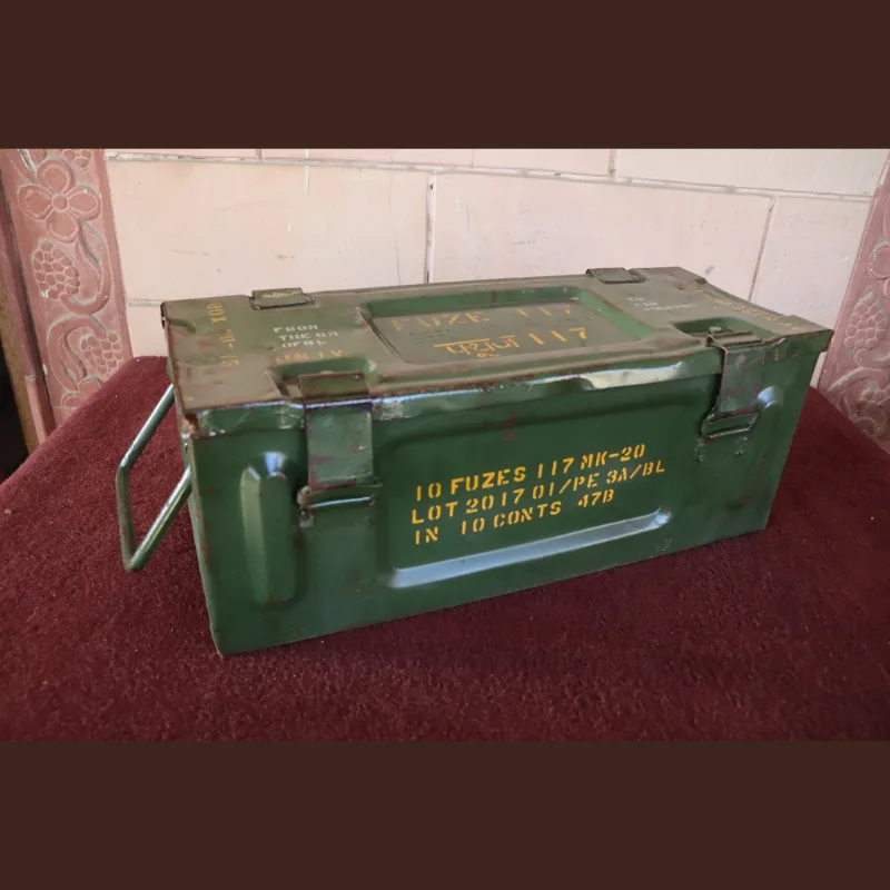Vintage ex-army iron ammunition box (approx. 5 kg) in brown finish. Built tough for military use — excellent as a tool box for Jeeps, Thar, gypsies, or tractors. Repaintable and durable; store heavy or valuable tools safely. Perfect for collectors, farmers, mechanics, or as rustic home decor.