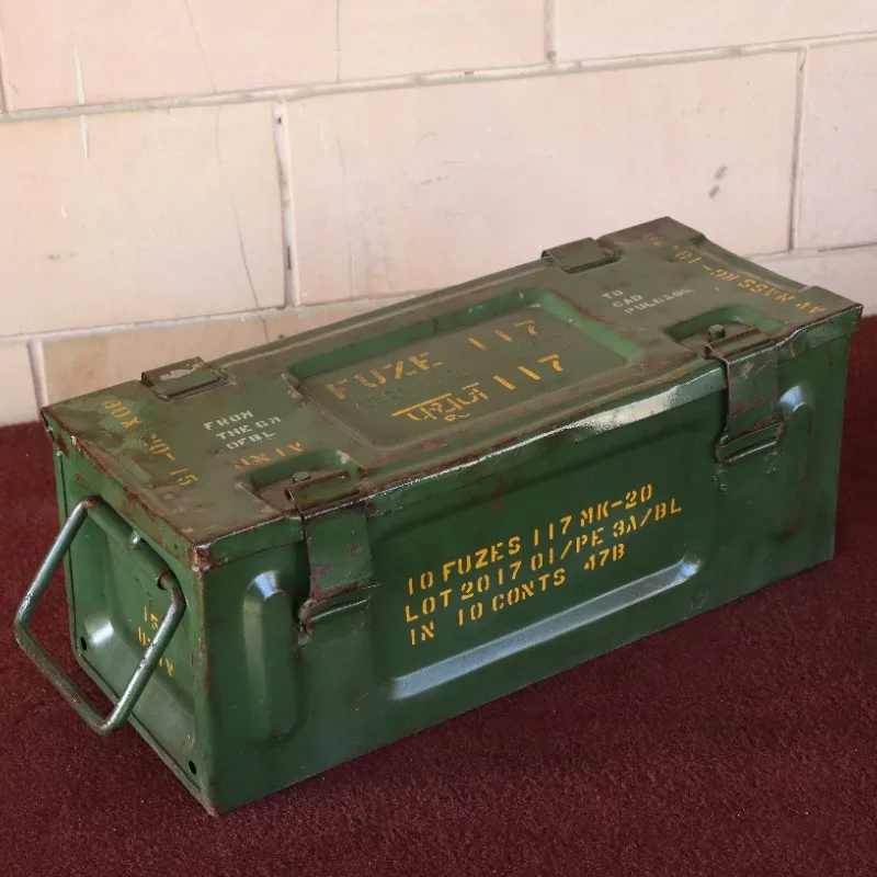 Authentic Military Surplus – Original UK-made ex-army ammo boxes from 1950s–60s with embossed years (1965, 1966).